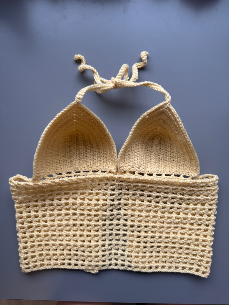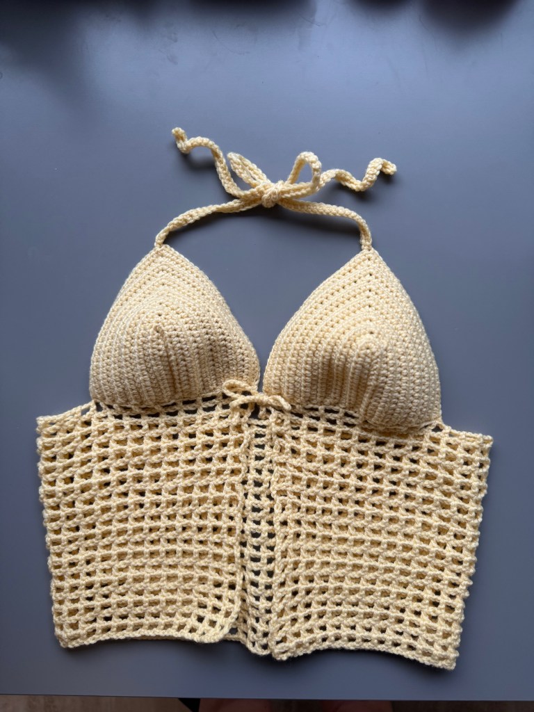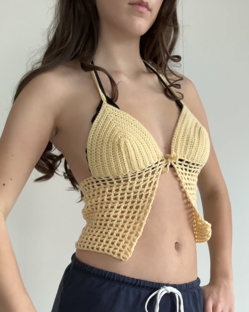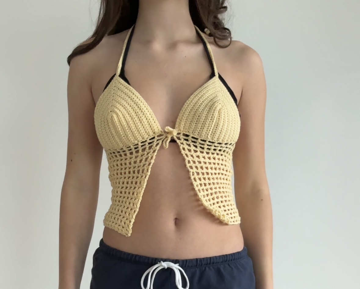 Das Netz-Top ist das letzte Stück meiner Sommerkollektion und bildet zusammen mit dem Filet-Rock ein passendes Set. Die festen Körbchen geben dem Oberteil eine schöne und stabile Form, während die netzartige Bauchpartie für einen luftigen und leichten Look sorgt. Das Top eignet sich perfekt für heisse Sommertage über einem Bikini oder als alleinstehendes Oberteil.